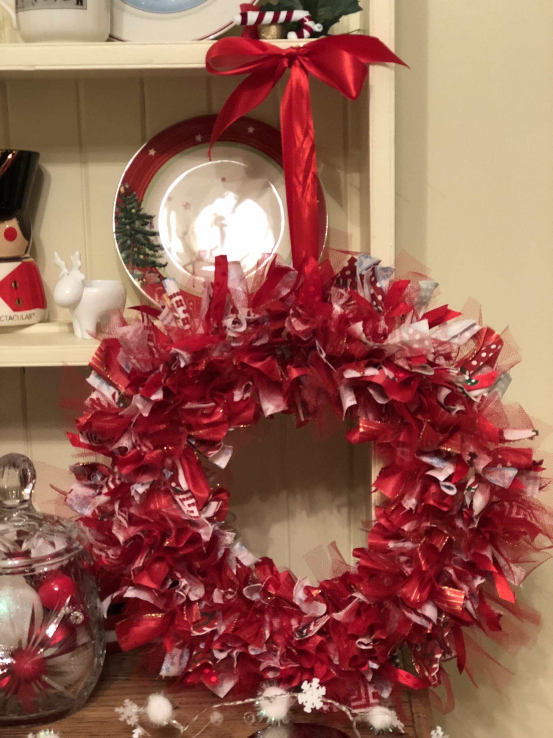 We tied the red ribbon on first so we knew where we’d started and it creates an anchor for the rest of the fabric to be pushed to. Remember to tightly tie the fabric and push it as close to the last piece as possible to create a full looking wreath.