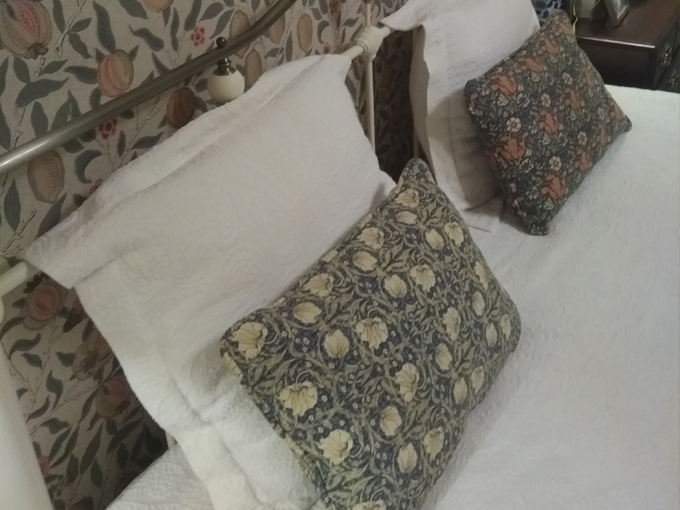 Cathy sent us this photo of her William Morris Willow Bough Green cushion cover. Cathy created this following an embroidery workshop with Sally Roberson in Hammersmith. The additional panel of embroidery on top of the Willow Bough fusion adds a personalised element. The embroidery class sounds very up our street!