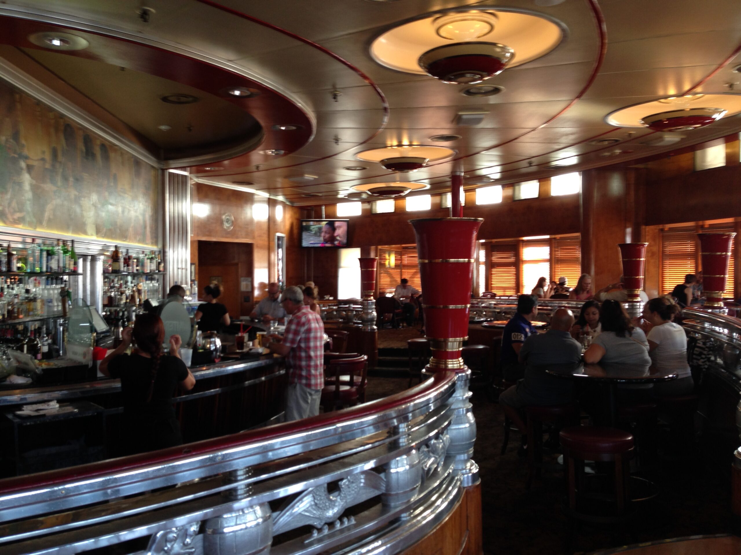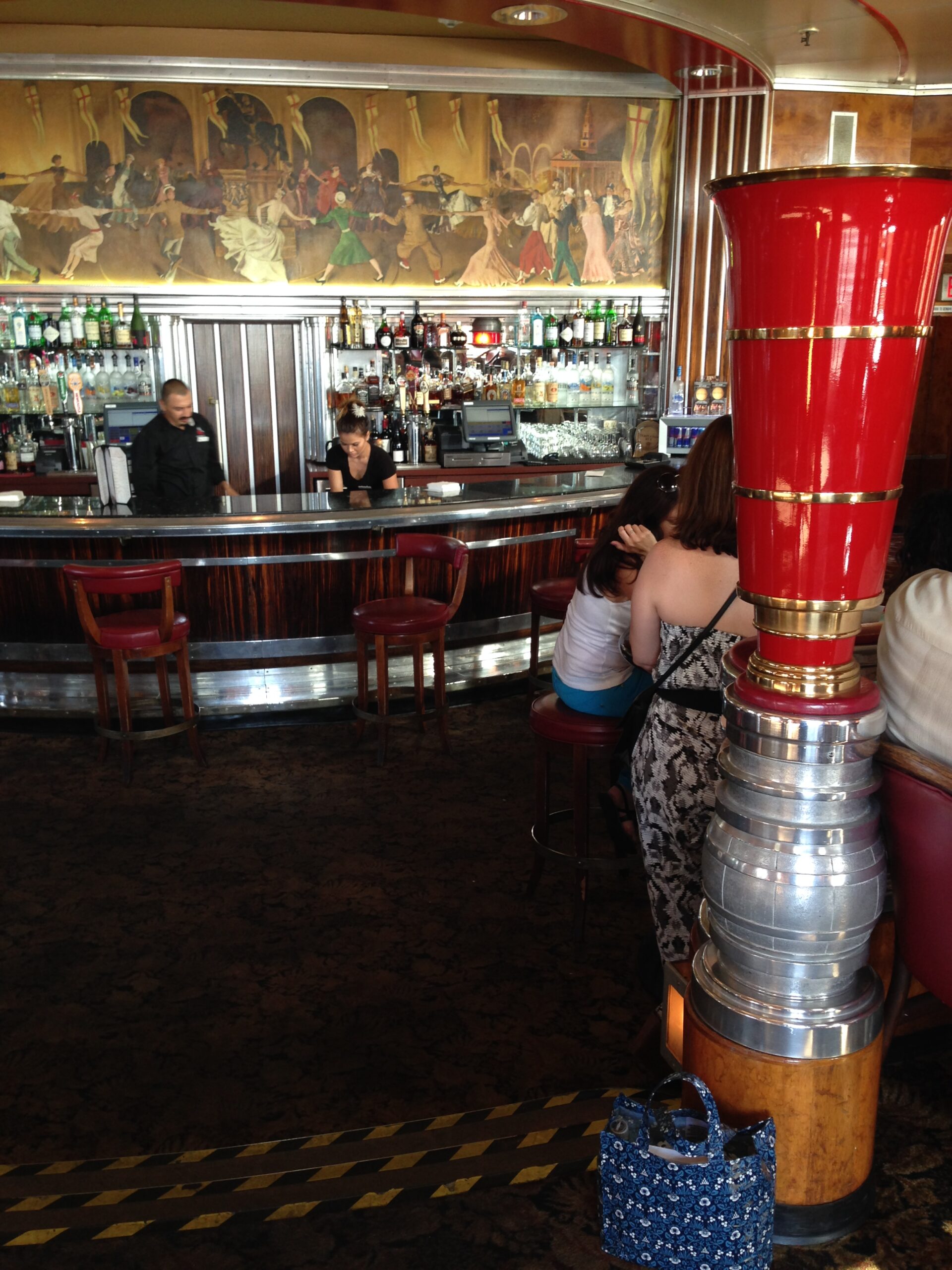 The bar is at the forward end of the ship on the promenade deck and was a popular meeting place for first class passengers.The Art Deco styling is complete and to sit and relax and look at the paintings and fixtures was just perfect!