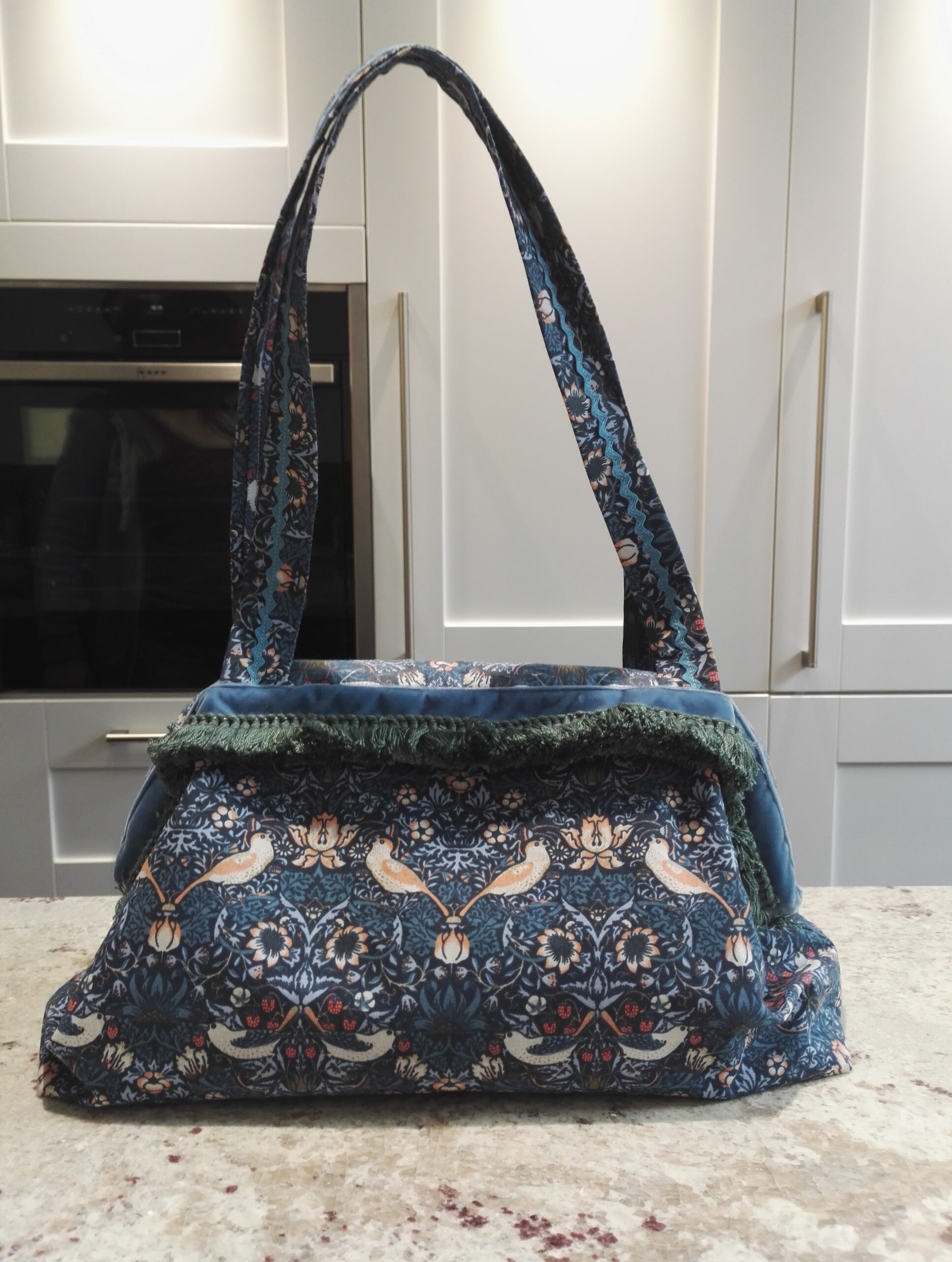 Karen made this wonderful Strawberry Thief bag, she wrote us a lovely email too: “I made my vintage bag and it looks lovely! I wanted it to have a carpet bag feel so I added the fringing. I didn’t want a contrast for the liner and outer so went with cotton Strawberry Thief for the outer and cotton drill Strawberry Thief for the liner which looks lovely. Just a slight difference in the two shades which gives variation without contrast.