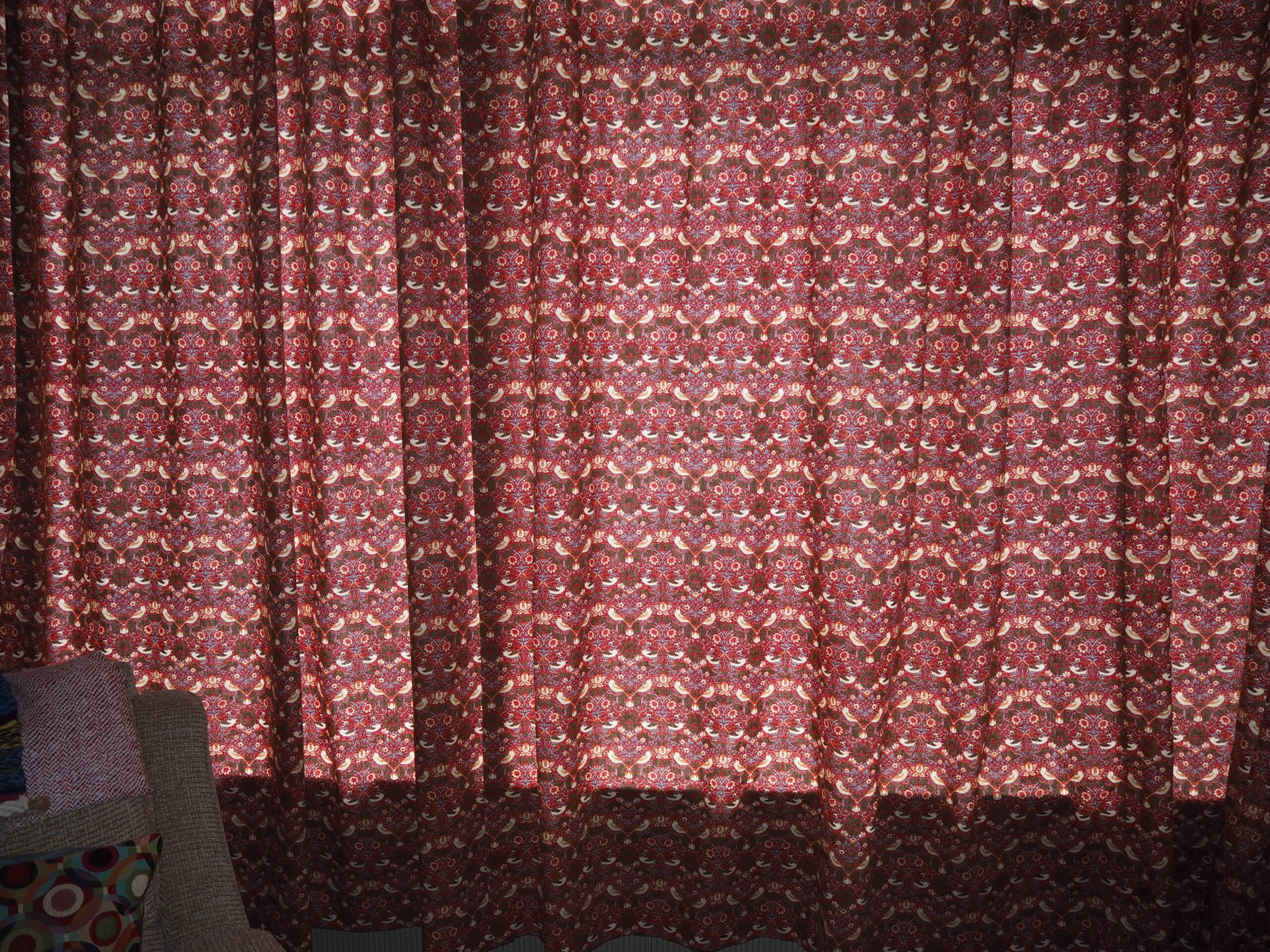 David made these William Morris Red Strawberry Thief curtains using 12 metres of heavy cotton fabric. Don’t they look wonderful on his window; the design really does look wonderful on big or small projects…