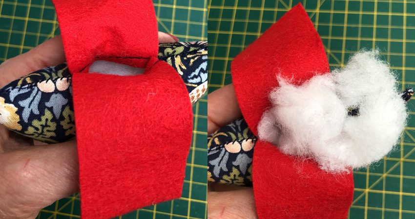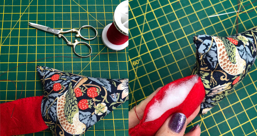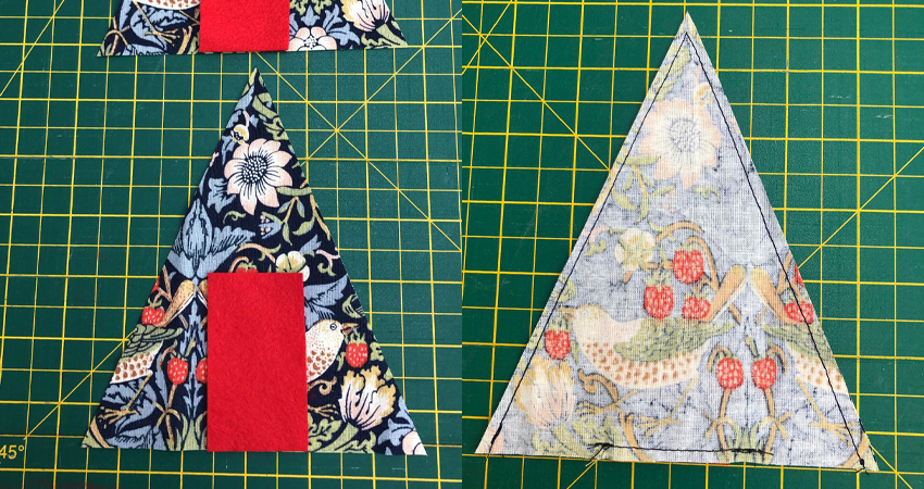 Turn inside out, we used a pencil to push out the point. Press along each edge with an iron and fill with stuffing, making sure to press firmly into the point. Don’t fill too full at the bottom edges as we’ll come back to this after stitching.